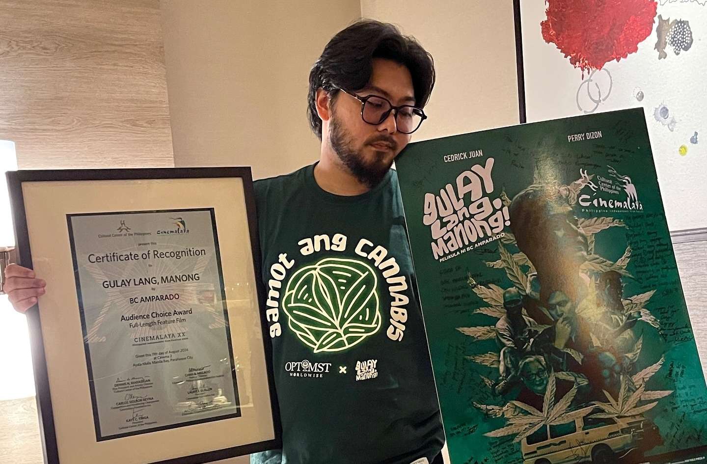 “May initial na takot kami sa simula kasi illegal nga siya [medical cannabis] dito. With the help of our consultants, inayos namin yung script according dun sa anong pwedeng ipakita at kung anong hindi. Very happy lang ako kasi audience choice siya. Recently, nakatanggap tayo ng good news na pumasa siya sa congress. May hope at very timely yung pelikula.” (Initially, we were scared about the public’s reaction because medical cannabis is illegal in the county. With the help of our consultants, we adjusted the script according to what can be shown and what can’t be shown. I’m just happy that it won as audience choice. Recently, we also received good news that the bill on the use of medical marijuana passed in congress. The film is indeed very timely as it brings hope)