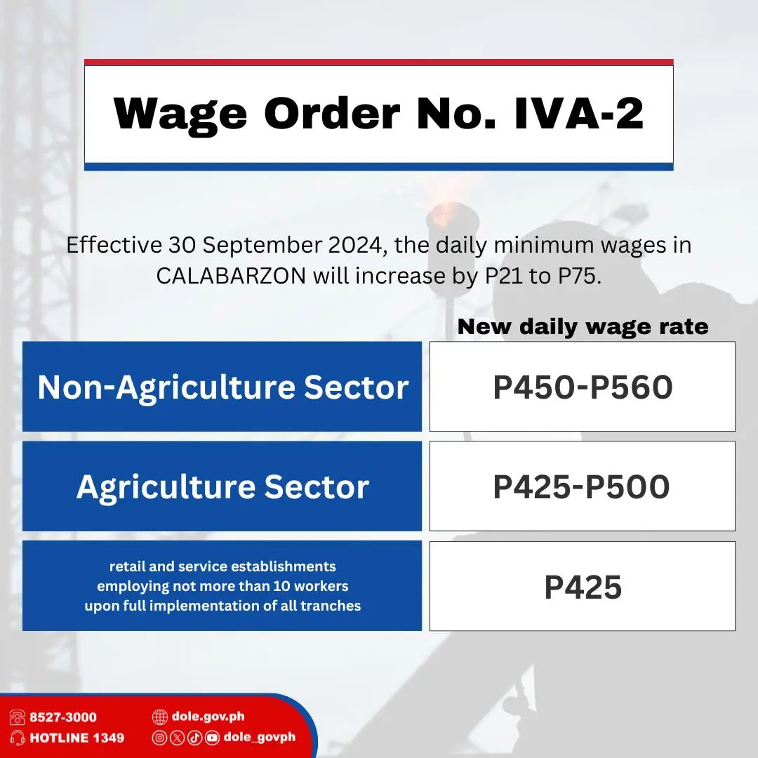 With this wage hike, non-agricultural workers in Calabarzon will now have minimum wages between ₱450 and ₱560 per day, while agricultural workers will earn between ₱425 and ₱500. Workers in retail and service establishments with more than 10 employees will receive a daily minimum wage of ₱425.