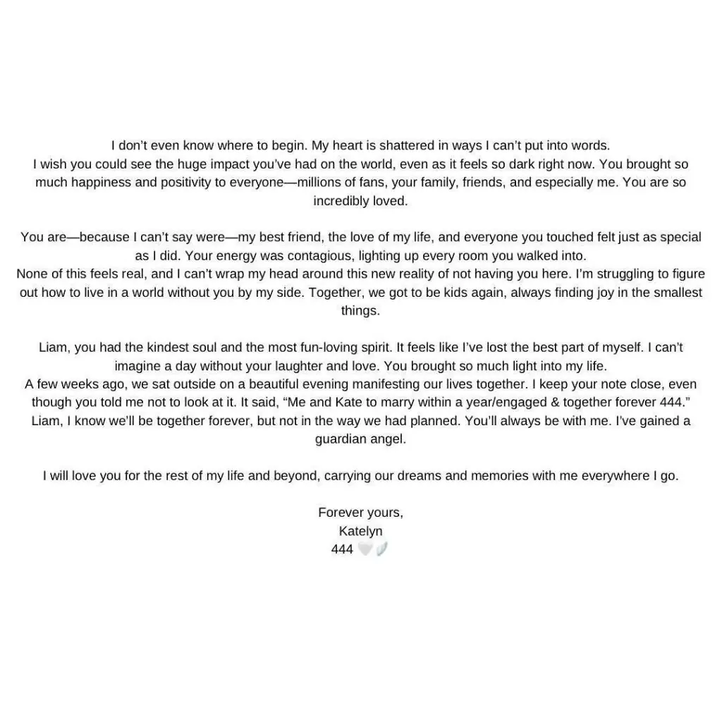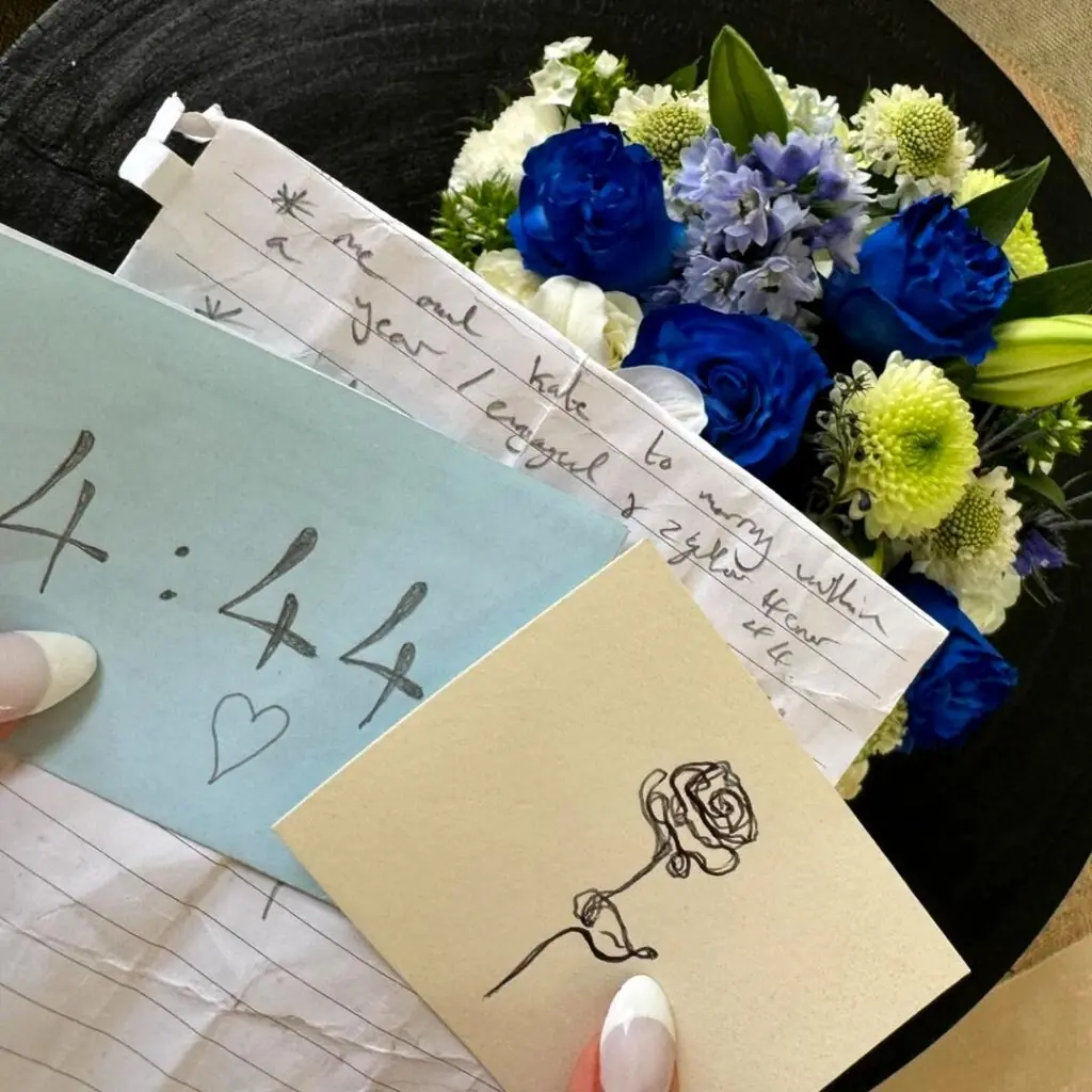 “A few weeks ago, we sat outside on a beautiful evening manifesting our lives together. I keep your note close, even though you told me not to look at it. It said, ‘Me and Kate to marry within a year/engaged & together forever 444’.”
