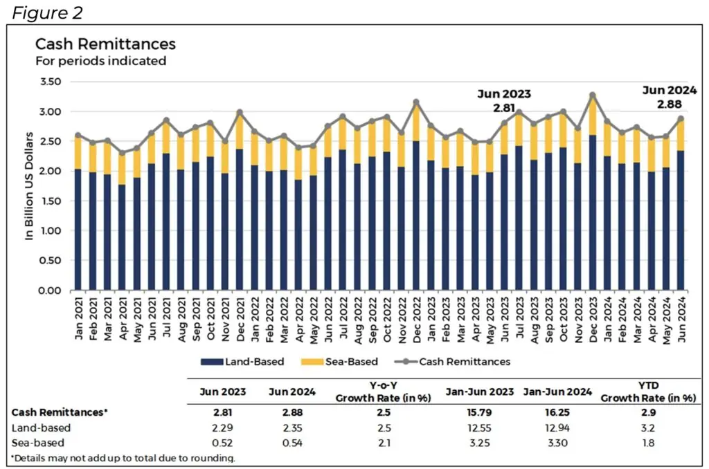 Of the personal remittances from OFs, cash remittances coursed through banks reached US$2.88 billion in June 2024, higher by 2.5 percent than the US$2.81 billion posted June 2023. The expansion in cash remittances in June 2024 was due to the growth in receipts from land- and sea-based workers.