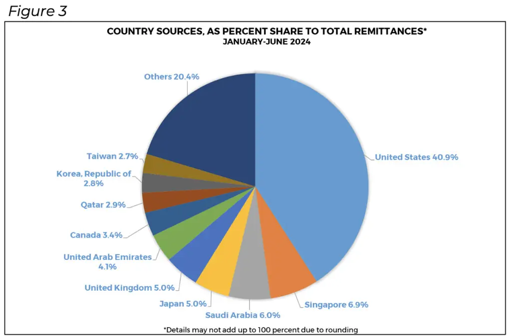 The growth in cash remittances from the United States (U.S.), Saudi Arabia, and Singapore contributed mainly to the increase in remittances in January-June 2024. Meanwhile, in terms of country sources, the U.S. also posted the highest share of overall remittances during the period, followed by Singapore and Saudi Arabia.