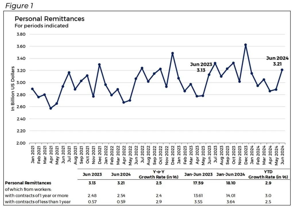 Personal remittances from Overseas Filipinos (OFs) rose by 2.5 percent to US$3.21 billion in June 2024 from US$3.13 billion registered in June 2023. The increase in personal remittances in June 2024 was due to higher remittances sent by 1) land-based workers with work contracts of one year or more and 2) sea- and land-based workers with work contracts of less than one year.