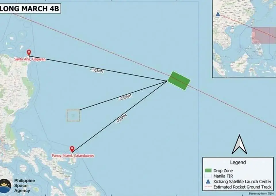 Debris from the rocket is anticipated to fall approximately 243 nautical miles from the Philippine Rise and 318 nautical miles from Panay Island, Catanduanes.