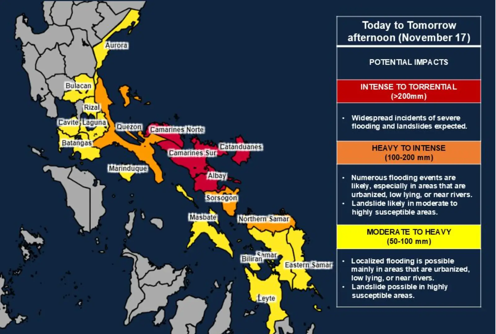From today until tomorrow afternoon, Catanduanes, Camarines Sur, Albay, and Camarines Norte are expected to experience intense to torrential rainfall exceeding 200 mm.