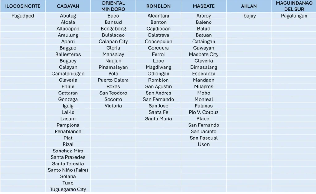 The NDRRMC has also declared a State of Calamity in 85 towns and cities across Ilocos Norte, Cagayan, Oriental Mindoro, Romblon, Masbate, Aklan, and Maguindanao del Sur.