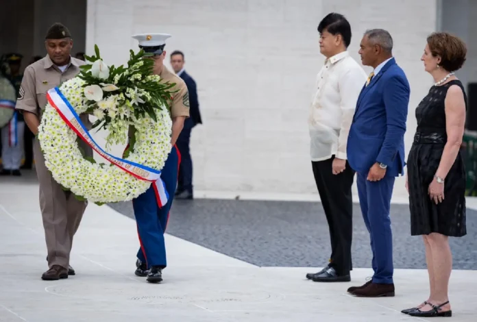 Left: (From right) U.S. Ambassador MaryKay Carlson, American Battle Monuments Commission Chairman Michael Garrett, and Philippine Department of National Defense Senior Undersecretary Irineo Espino...