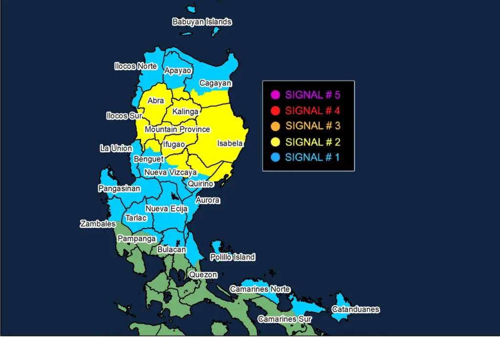 Signal No. 1 remains in effect across a wide swath of Northern and Central Luzon, including Ilocos Norte, La Union, Pangasinan, Zambales, Tarlac, Nueva Ecija, Bulacan, Pampanga, Quezon, Camarines Norte, Camarines Sur, and Catanduanes.