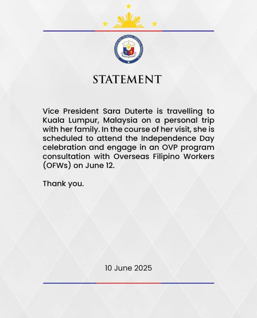 In a statement released on Tuesday, the Office of the Vice President (OVP) confirmed Duterte’s travel, stating that she is scheduled to attend the Philippine Independence Day celebration in Malaysia on June 12 and meet with overseas Filipino workers (OFWs) for an OVP-led program consultation.